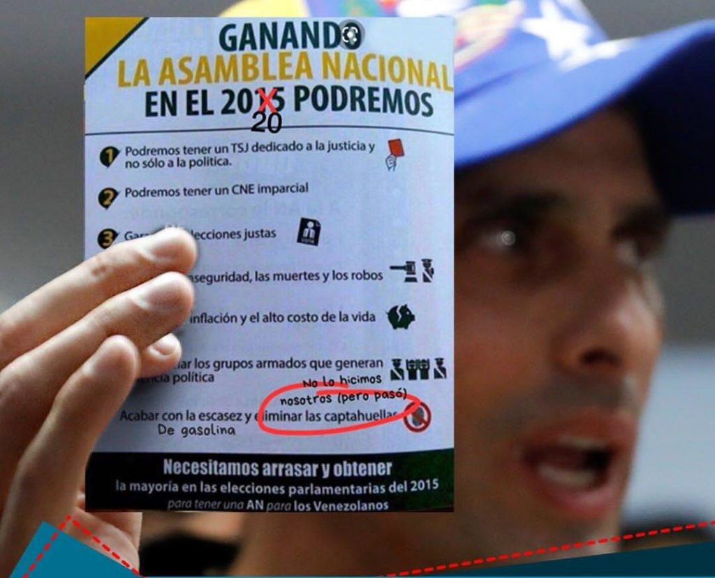 Capriles, quien se abre camino a la fuerza para recuperar su protagonismo, como quien hace una carretera en las zonas más sensibles de la gran sabana, declaró que “por algo – mire – a mi me sobró tanto panfleto del 2015 en mi edificio de Bello Monte – mire – com pequeños ajustes siguen vigentes, tenemos las promesas, tenemos el plan y sobre todo la ruta – la r u t a – sin gastar tanta tinta y papel”.